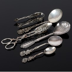 289305 - Щипцы для сахара, 14 гр, 830 пр, 8,3 см 371265 - Сервировочная лопатка, 16 гр, 830 пр, 12,3см 313500 - Сервировочная или обеденная ложка, 43 гр, 830 пр, лом 204642 - Ситечко, 58 гр, 830 пр, 17 см, размеры черпака 5,6 х 3,7 см 344686 - Солонка со стеклянной вставкой и ложкой, общий вес без стекла 35 гр, 830 пр 373023 - Кольцо для салфеток, 17 гр, 830 пр, высота 3,7 см, диаметр 4,5 см,