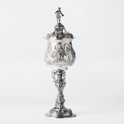 | 371094 - Кубок с крышкой, Германия, г. Ханау, 916 гр, 13 лотов, максимальная высота 42 см, высота по край 29,5 см, диаметр основания 12,2 см, диаметр верха 10,7 см |