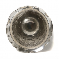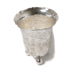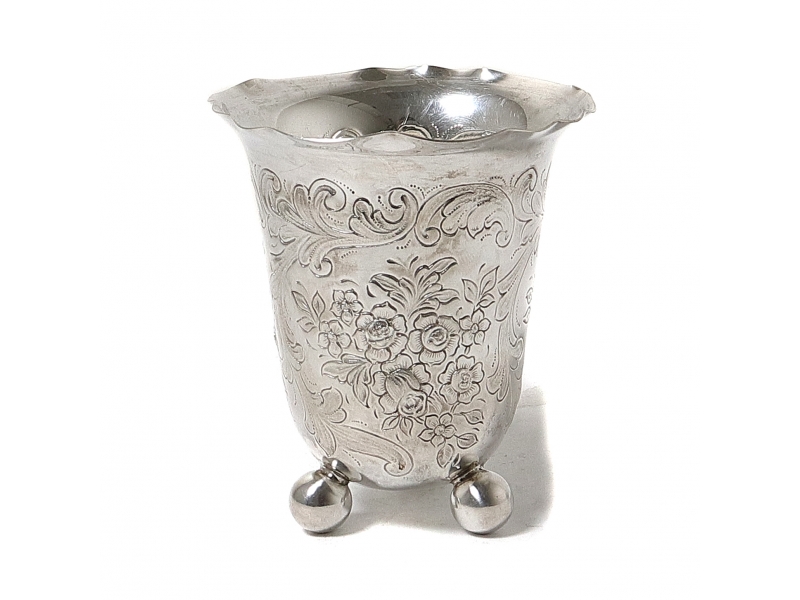 Высота: 10,2 см, диаметр верха: 8,8 см. Объём: 200 мл. Вес: 89 граммов серебра 830 пробы. ============================ Designer silver beaker (cup) on ball-shaped legs, decorated with plant patterns. Designer Andersson Lisa.