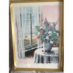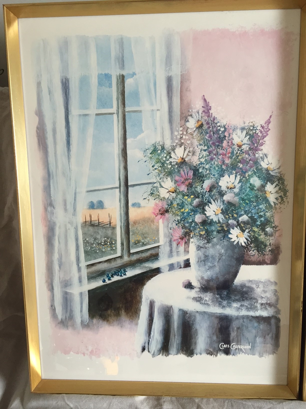 Натюрморт "Полевые цветы у окна". Бумага, акварель(?). Цветная литография. Швеция, г. Бурос. Автор Claes Caspersson (г.р. 1953). Внешние размеры: 52 х 57 см.