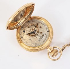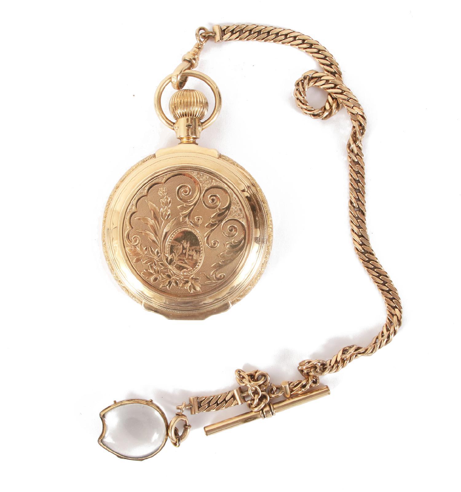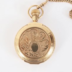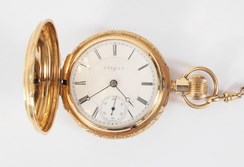 149647 - Золотые карманные часы с позолоченной цепочкой-кулоном для фотографий. США, Elgin, начало 20 века. Общий вес без цепочки - 148 граммов. Золото 585 пробы. Диаметр корпуса - 5,5 см. Длина цепочки - 34 см.