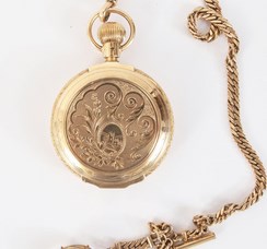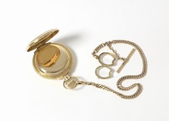 Золотые карманные часы с позолоченной цепочкой-кулоном для фотографий. США, Elgin, начало 20 века. Общий вес без цепочки - 148 граммов. Золото 585 пробы. Диаметр корпуса - 5,5 см. Длина цепочки - 34 см.