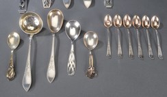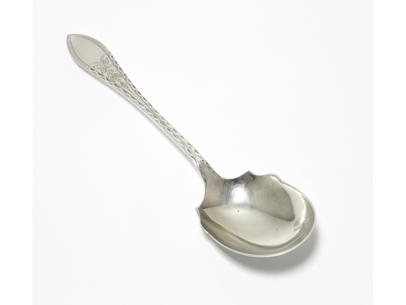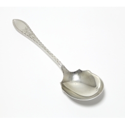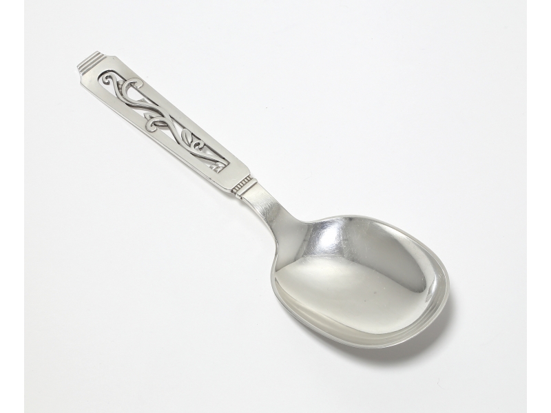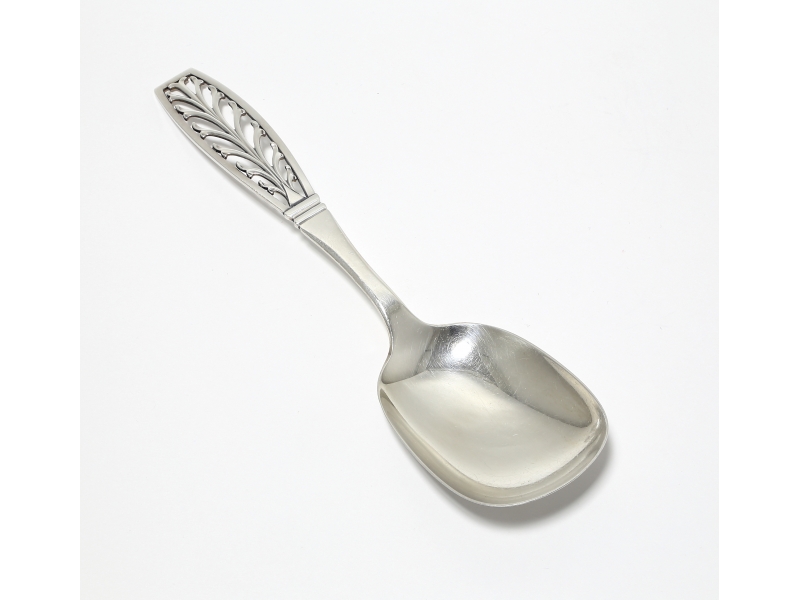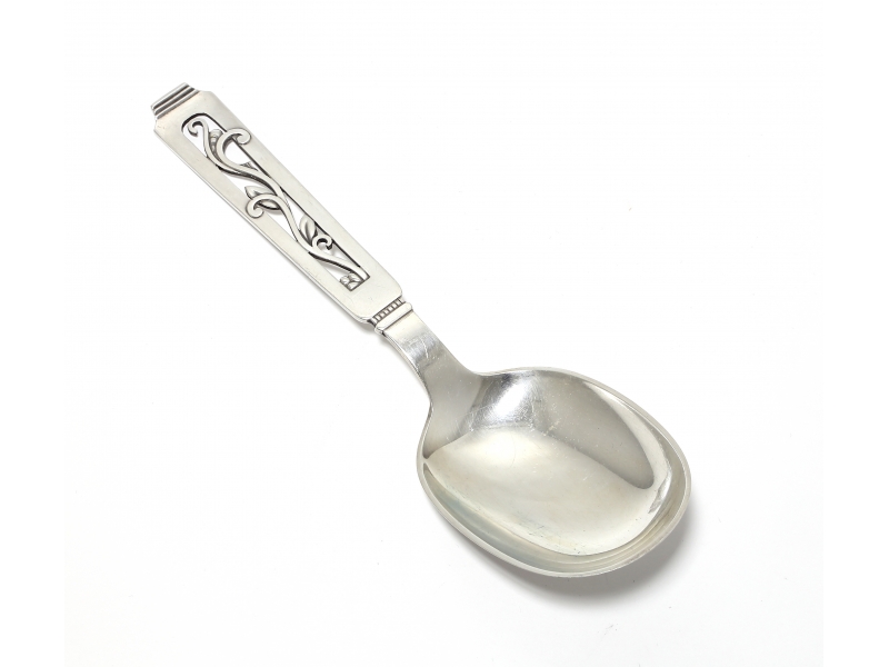 190519 - Серебряная сервировочная ложка. Дания, 1943 год.Серебряная сервировочная ложка с прорезной ручкой, арт нуво. Дания, 1943 год. Длина - 22,5 см. Вес - 85 граммов серебра 826 пробы.
