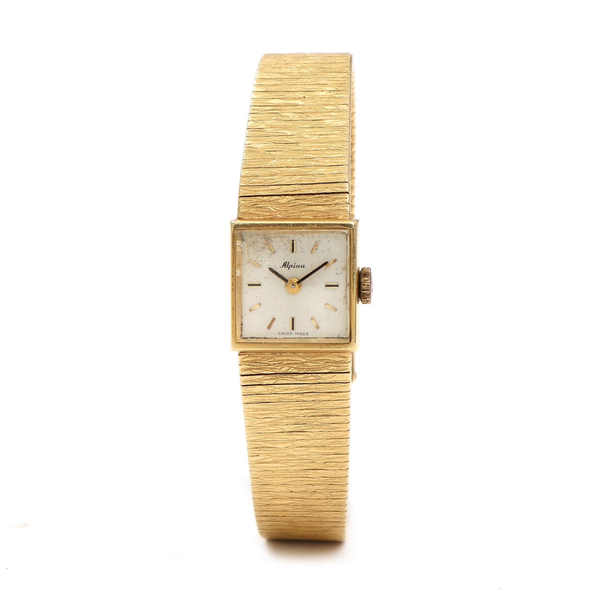 Женские золоты наручные часы Alpina, механика, общий вес 39,3 грамма, золото 750 пр, размеры корпуса 1,5 х 1,5 см, длина браслета 17 см.