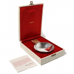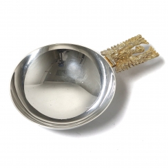 Высота: 3,7 см, диаметр: 11,5 см, длина с ручкой: 17,5 см. Вес: 228 граммов серебра 925 пробы.