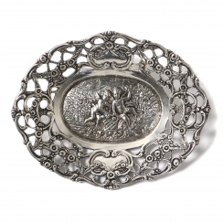 Высота: 1,7 см, длина: 10,5 см, ширина: 8,5 см. Вес: 41 грамм серебра 830 пробы. ========================= Silver open-work bowl with putti.