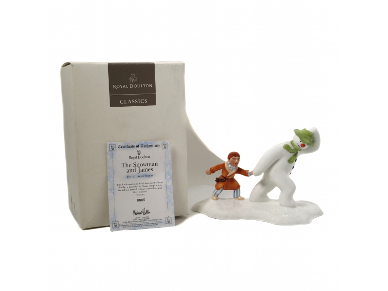 Фарфоровая фигура (статуэтка) "Снеговик и Джеймс. Приключение начинается". Статуэтка была создана по мотивам книги Раймонда Бриггса "Снеговик". Ручная подглазурная роспись. В оригинальной коробке. Сертификат.