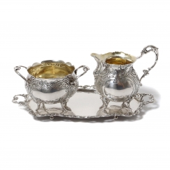 244080 - Серебряные сахарница и молочник на подносе. Швеция, 1965 год.Серебряные сахарница и молочник на подносе, декорированные растительным орнаментом.