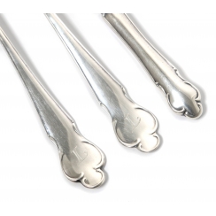 Общий вес цельно серебряных приборов: 73 грамма серебра 830 пробы. Вес ножа с серебряной ручкой и стальным лезвием: 37 граммов.