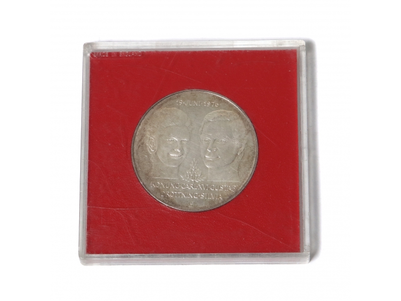Швеция, 1976 год. Диаметр: 36 мм. Вес: 27 граммов серебра 925 пробы. ============================== Commemorative silver 50 kronor coin. "Konung Carl XVI Gustaf Drottning Silvia 19 Juni 1976". In a capsule.