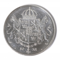 296863 - Серебряная юбилейная монета 50 крон. Швеция, 1976 год.Серебряная юбилейная монета номиналом 50 крон "Свадьба Короля Карла XVI Густава и Королевы Сильвии 19 июня 1976 года".