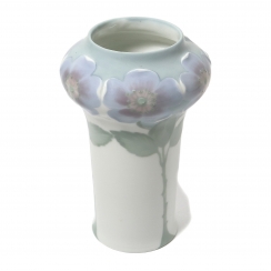 Уникальная фарфоровая ваза, модерн. Декор представляет собой рельефные цветы (анютины глазки), чьи нежные фиолетово-голубые лепестки формируют край горлышка, а тонкий зеленый стебель с листьями плавно спускается по тулову на фоне светлой подглазурной росписи. Ручная подглазурная роспись по рельефу.