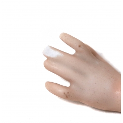 There is a chip on the ring finger of the right hand and on the middle finger of the left.