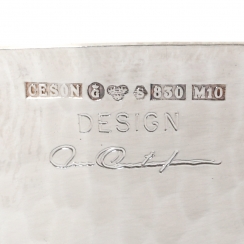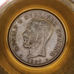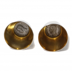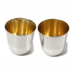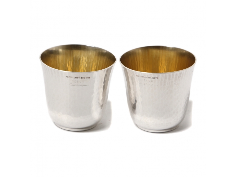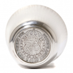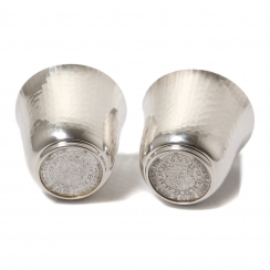 186841 - Дизайнерские стопки с монетой на дне, ковка, 2 шт, 64 гр, 830 пр, высота 4,4 см, диаметр верха 4,5 см