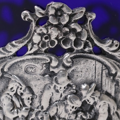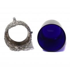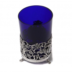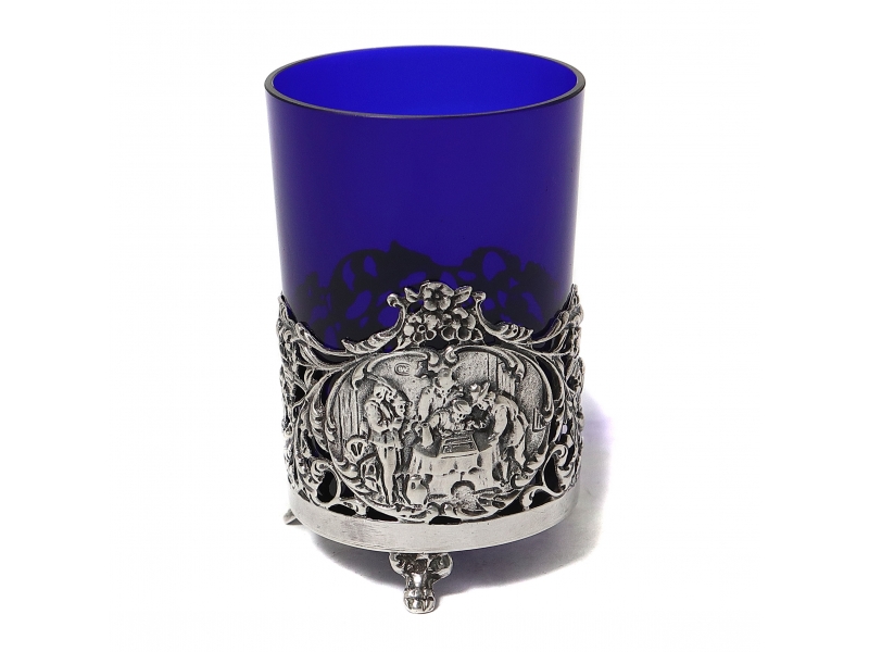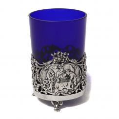 Высота: 9 см, диаметр верха: 5,2 см. Объём: 100 мл. Вес без стекла: 40 граммов серебра 934 пробы. ========================== Stand (beaker or vase). Cobalt glass, silver 934 fineness. Decorated with a relief floral pattern and a plot miniature.