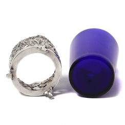Подставка (стакан или ваза). Кобальтовое стекло, серебро 934 пробы. Декорирована рельефным растительным узором и сюжетной миниатюрой.