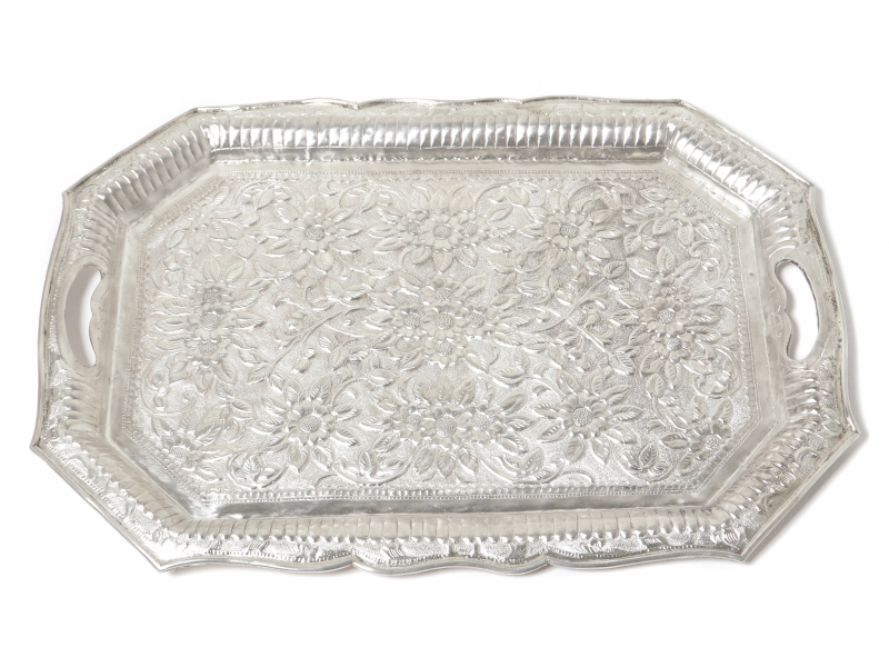 Серебряный поднос с ручками, декорированный растительным орнаментом.