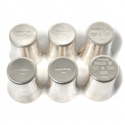 Высота: 5,2 см, диаметр верха: 4,7 см. Объём: 50 мл. Общий вес: 245 граммов серебра 830 пробы. =============================== Silver vodka cups (shot cups), 6 pcs. Designer Erik Lofman (Erik Löfman). Handmade (haands medet).