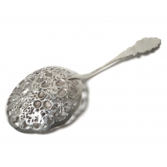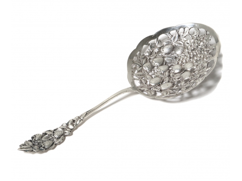 Серебряная сервировочная ложка с перфорированным черпаком (ситечко), декорированная ягодами.