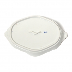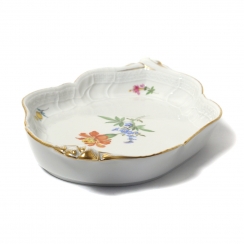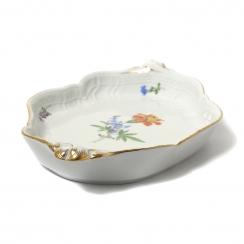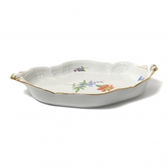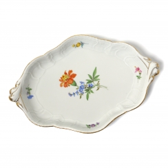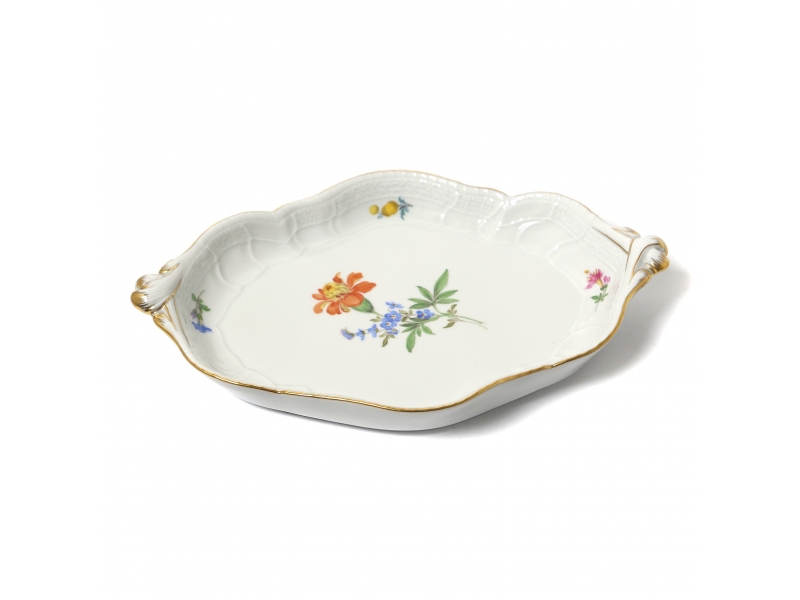 Фарфоровое блюдо. Овальное сервировочное блюдо выполнено в форме "Neuer Ausschnitt" («Новый вырез» или «Новый фасон»), которая характеризуется элегантными волнистыми, фестончатыми краями и позолоченным ободком и ручками. Декор изделия представляет собой изображением центрального букета и отдельных разбросанных цветов. Дизайн "Рассыпанные цветы". Ручная роспись.