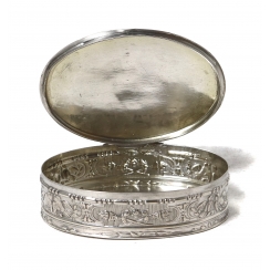 Небольшая серебряная овальная коробка (шкатулка), декорированная растительным орнаментом и птицами.