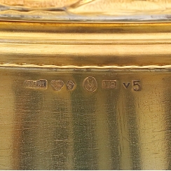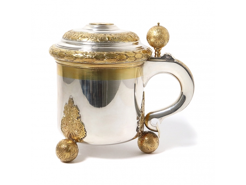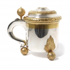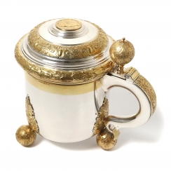 Серебряная кружка с откидной крышкой на ножках-шарах. Позолота. На крышке медальон с профилем короля Швеции Густава V (годы правления: 1907 - 1950) с надписью по кругу" Gustaf V Sveriges Konung".