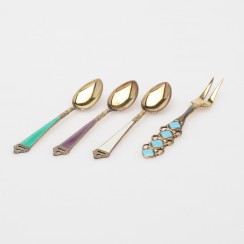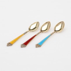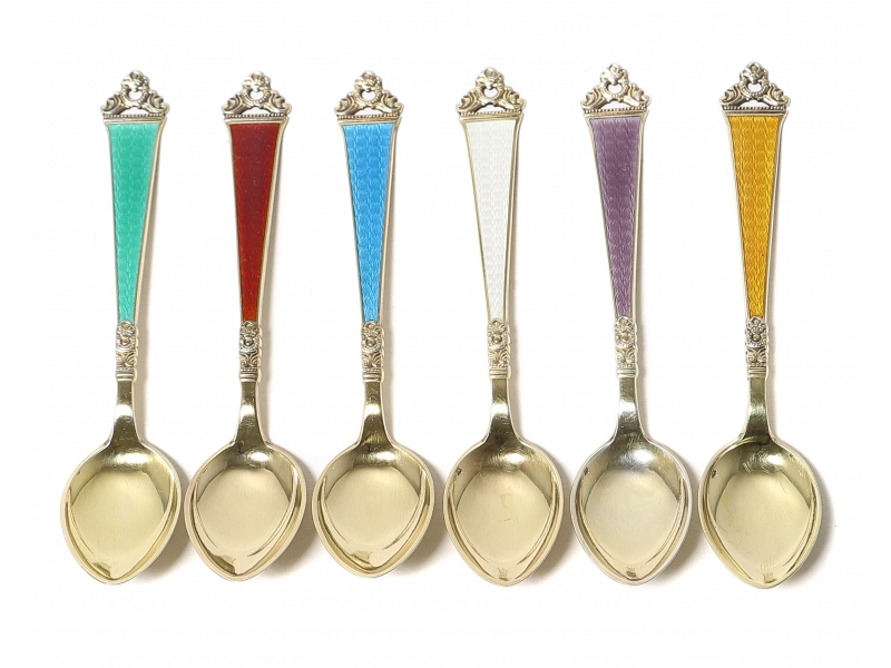 236807 - Кофейные ложки, 6 шт. Серебро, позолота, эмаль. НорвегияКофейные ложки, 6 шт. Серебро, позолота,эмаль по гильошу. Дизайн "Anitra".