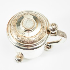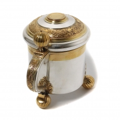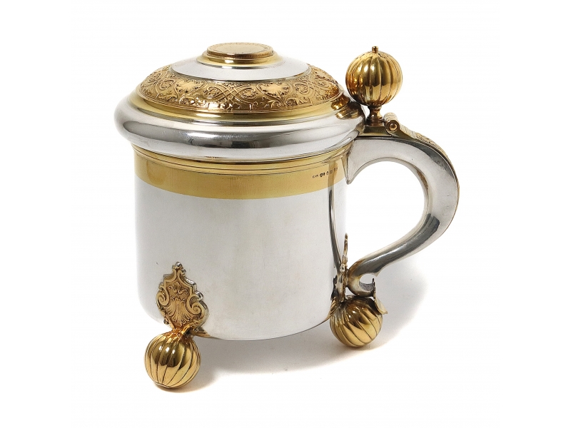 Серебряная кружка с откидной крышкой на ножках-шарах. Позолота. На крышке медальон с профилем короля Швеции Густава V (годы правления: 1907 - 1950) с надписью по кругу" Gustaf V Sveriges Konung".