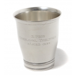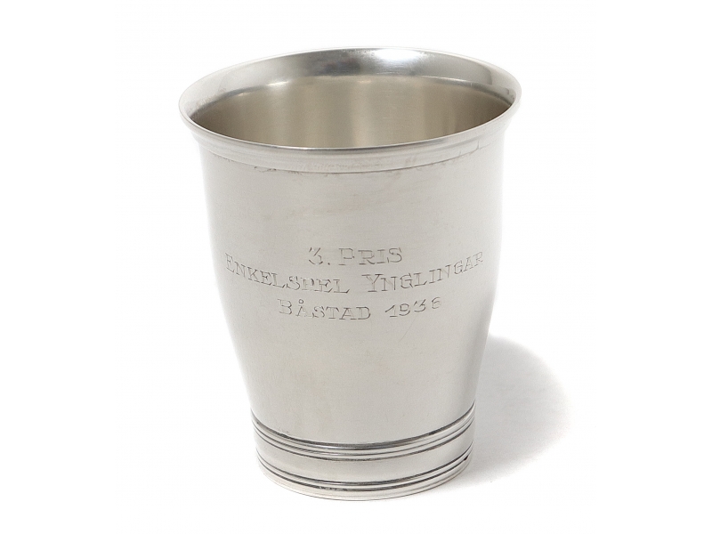 На боку небольшая вмятинка. С гравировкой (3 приз в одиночных играх среди юниоров Бостад 1936). ============================== Small silver beaker or cup.