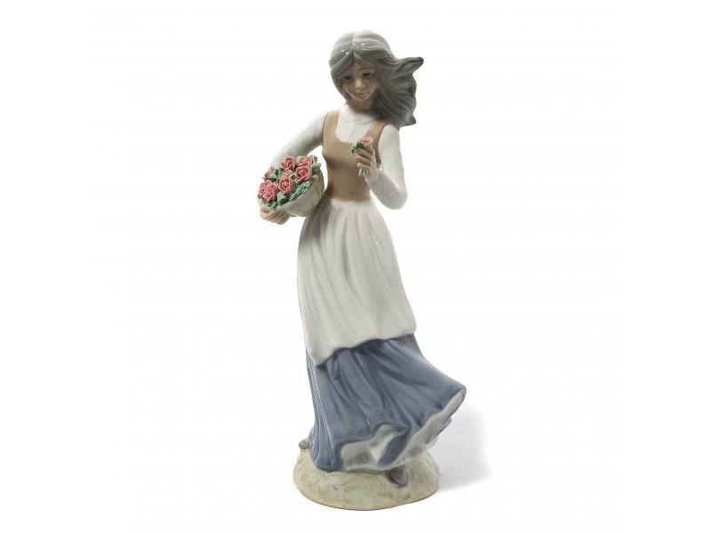 Фарфоровая фигура (статуэтка) "Девушка с корзиной роз". Ручная подглазурная роспись.