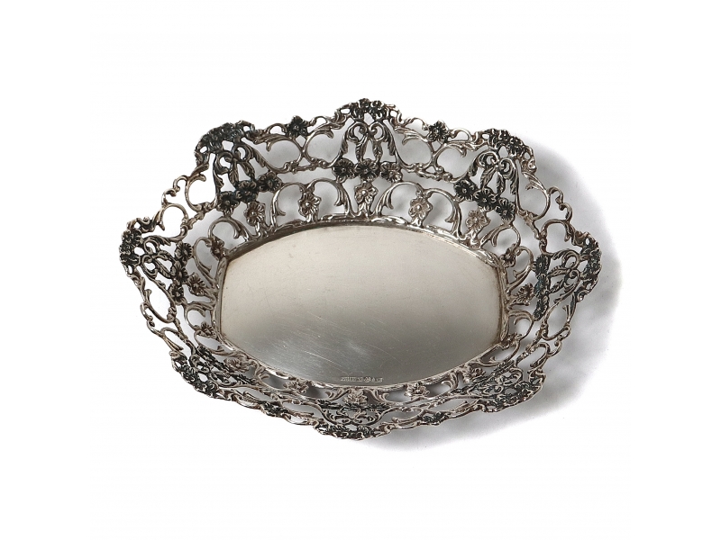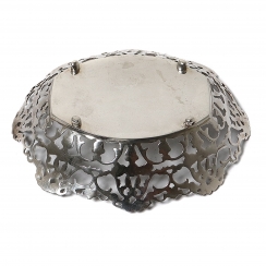 Размеры: 15,5 х 13 х 4,1 см. Вес: 110 граммов серебра 830 пробы. ========================= Silver open-work bowl on legs, decorated with floral pattern.