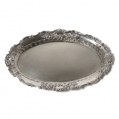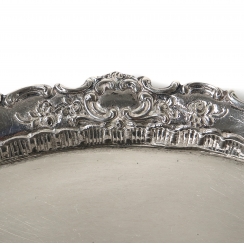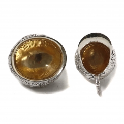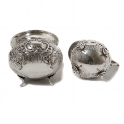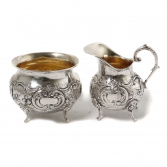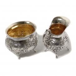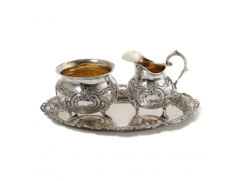 Небольшие серебряные сахарница и молочник на подносе. Декорированные растительным орнаментом.