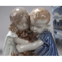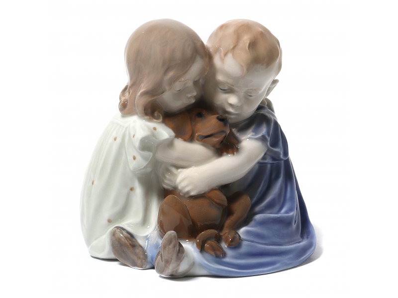 Фигура производилась также после объединения фабрик Royal Copenhagen и Bing & Grondahl (1985-1989) под брендом Royal Copenhagen, номер модели: 070. ============================== Porcelain figurine "Children with dog". Hand-painted underglaze.