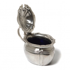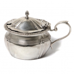 Серебряная горчичница с стеклянной вставкой.
