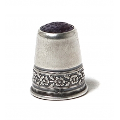 Высота: 2,3 см, диаметр: 1,7 см. Вес: 4 грамма, серебро 830 пробы. ================== Silver thimble with purple insert, decorated with roses.