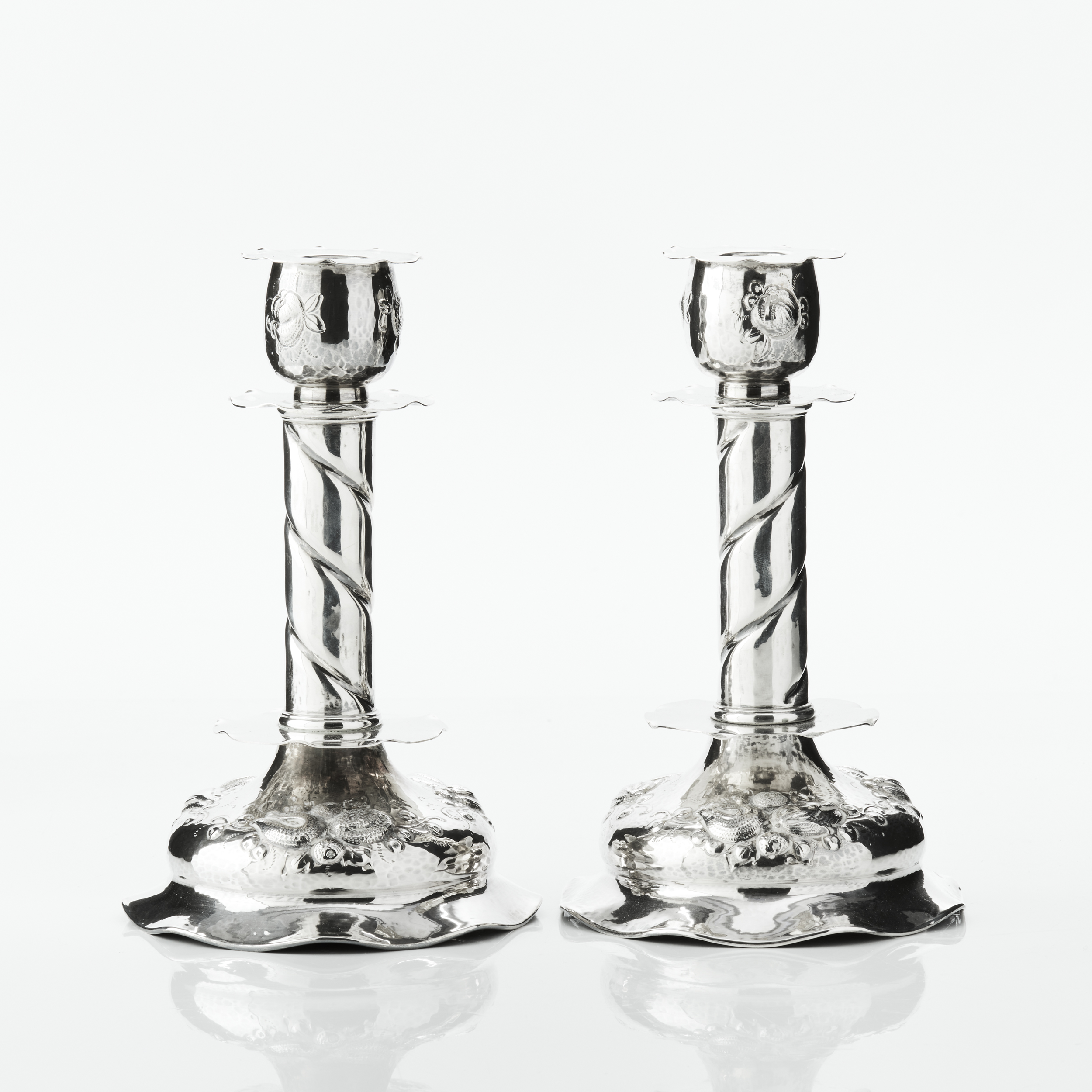 Высота: 21,5 см, диаметр основания: 13,1 см, диаметр отверстия для свечи: 2,3 см Общий вес: 616 граммов серебра 830 пробы. =============================== Silver candlesticks, 2 pcs, decorated with large fruits. Designer Erik Råström (Erik Rastrom).