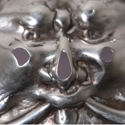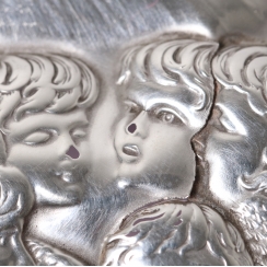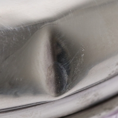There are numerous small dents on the silver frame of the top of the crystal bowl. There is also a small dent on the lid.