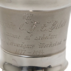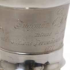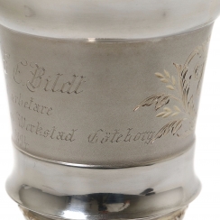 Height: 24.2 cm, base diameter: 10 cm, diameter of the top: 11.2 cm. Volume: 400 ml. Weight: 225 grams of silver 830 fineness.