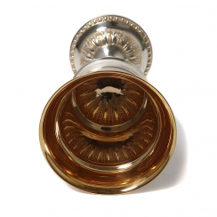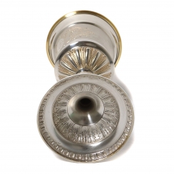 Высота: 24,2 см, диаметр основания: 10 см, диаметр верха: 11,2 см. Объём: 400 мл. Вес: 225 граммов серебра 830 пробы.