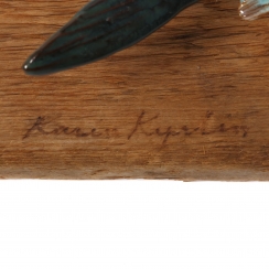 Karin Kyrlin is a Swedish artist and ceramicist known for her distinctive fish figurines, which she hand-sculpts from glazed ceramic and mounts on natural driftwood or a wooden base.