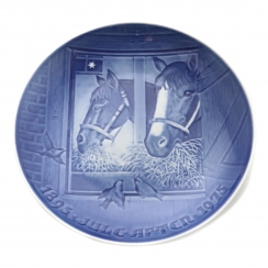 Коллекционная фарфоровая тарелка 1895-1975 гг. "Лошади наслаждаются едой" (Heste i stalden nyder julemåltidet) из серии Рождественских юбилейных тарелок. На представленной тарелке воспроизведен мотив рождественской тарелки 1941 года.
