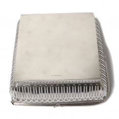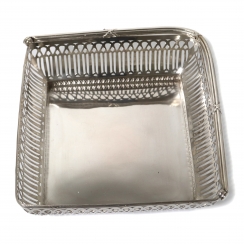 Размеры чаши: 17,8 х 17,8 х 5,8 см, высота по верх поднятой ручки: 18,5 см. Вес: 369 граммов серебра 800 пробы. ========================= Silver bowl with slotted sides and a reversible handle.