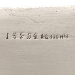 Bowl dimensions: 17.8 x 17.8 x 5.8 cm, height above the raised handle: 18.5 cm. Weight: 369 grams of silver 800 fineness.