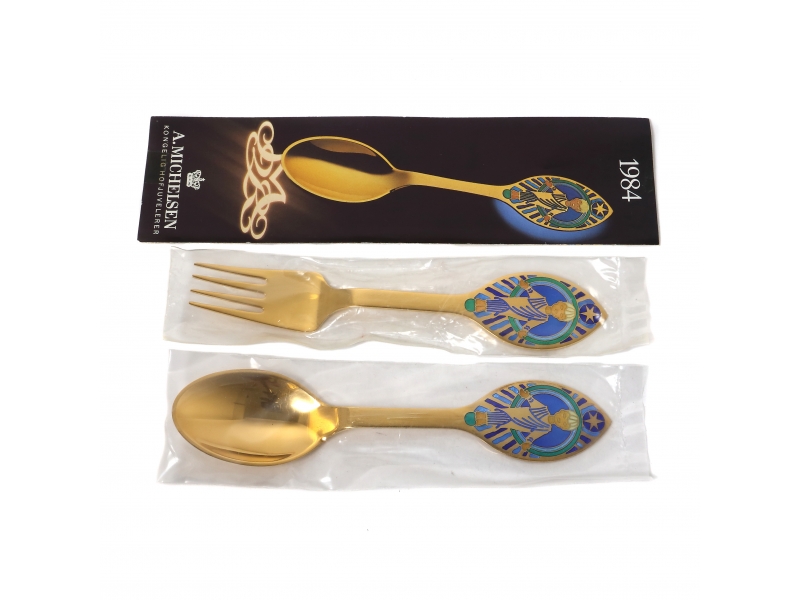 Автором дизайна представленных приборов стала королева Дании Маргрете II. Ложка украшена изображением Младенца Христа в обрамлении графичного орнамента, выполненного в различных оттенках синей и зелёной эмали. ================================== The Danish сollection dessert spoon and fork "Baby Jesus". Silver, gilding, enamel.