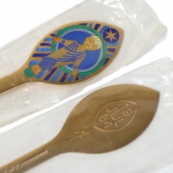 The design for the presented cutlery was created by Queen Margrethe II of Denmark. The spoon is decorated with an image of the Christ Child framed by a graphic ornament, executed in various shades of blue and green enamel.