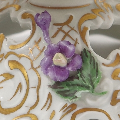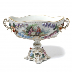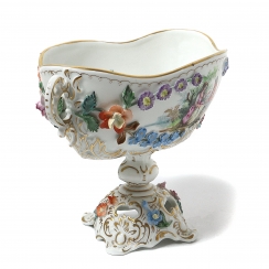 Фарфоровая ваза на ножке, декорированная сюжетной миниатюрой и рельефными цветами. Ручная роспись, роспись золотом.