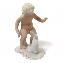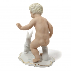 Фарфоровая фигура (статуэтка) "Обнаженный мальчик (путти) с кроликом". Ручная роспись.