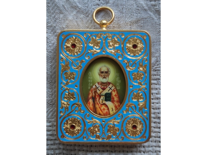 Икона Николая Чудотворца в окладе в стиле модерн. Размеры без кольца 5,5 х 6,7 х 1 см Образ написан масляными красками на цинковой пластине. Оклад изготовлен из серебра и позолочен; декорирован гравированным раститеным орнаментом и горячей эмалью. В качестве конструктивного элемента предмета использована доска из кипариса, подбитая бархатом. Футляр 11,3 х 13 х 3 см