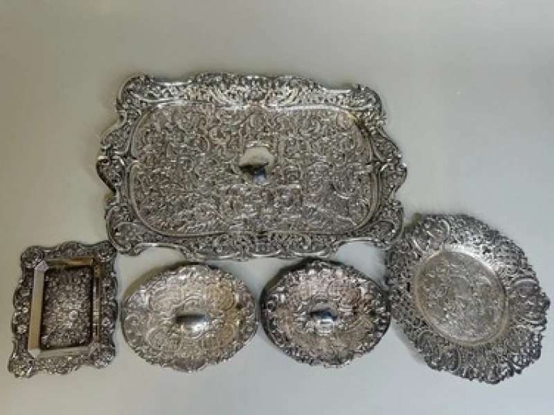 184087 - Поднос, 327 гр, 925 пр, максимальные размеры 30,5 х 20,5 х 2,7 см 357025 - Ваза, 212 гр, 925 пр, диаметр 16 см, высота 1,7 см 290834 - Ваза, 38 гр, 915 пр, 11 х 8,3 х 0,7 см 399288 - Ваза, 29 гр, 925 пр, 11,7 х 9 х 1,8 см 374457 - Ваза, 27 гр, 925 пр, 11,7 х 9 х 1,8 см