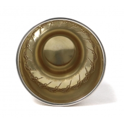 Высота: 8 см, диаметр верха: 15,5 см. Вес: 193 грамма серебра 830 пробы.